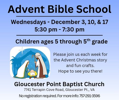 Advent Bible School: There will be three nights of Advent Bible School during the 2025 Christmas season: December 3, 10, & 17 5:30 - 7:30 PM for children ages 5 years old through 5th grade. Parents who would like to take part may sit with younger children to assist them or observe while they complete their Christmas craft projects and enjoy other Advent activities. Don’t miss this wonderful opportunity to explore the true meaning of Christmas!